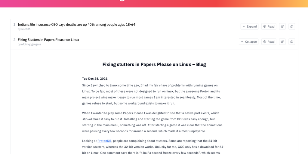 Read top articles from HackerNews in a clean, simple and minimal interface without ads or any other distractions. HackerScroll also allows you to read all of HackerNews on the same tab.