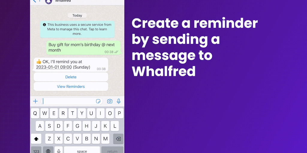 Create reminders by simply messaging the Whalfred Whatsapp contact, such as “Check in for London’s flight @ next Friday”. When the time comes, Whalfred will send the message back to you. It’s complete