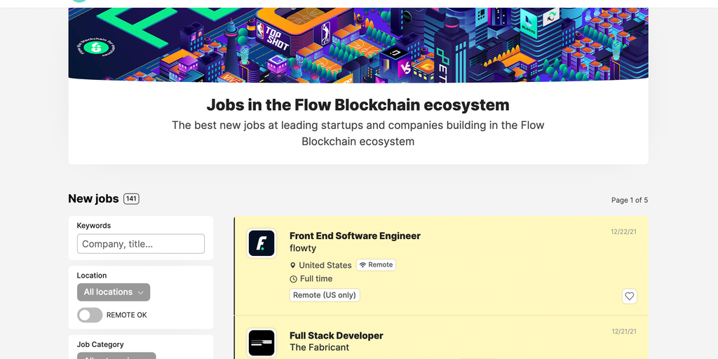 The Flowverse jobs board lists all jobs from start-ups building in the Flow Blockchain ecosystem. We have partnered with many NFT businesses including Dapper Labs for launch with over 140 job listings