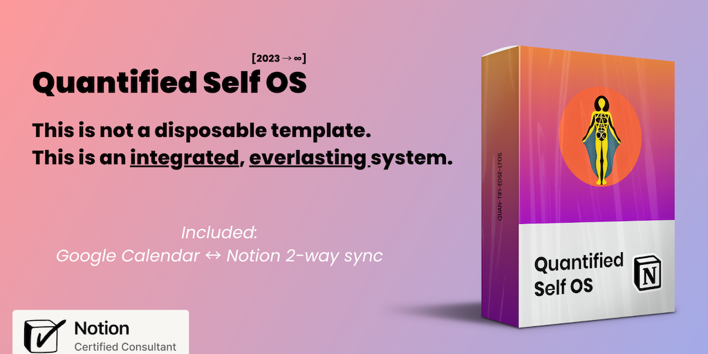Built on Notion, Quantified Self OS tracks your time, habits & routines sustainably over time. This is not a disposable template. This is an integrated, everlasting system. Included: Google Calendar →