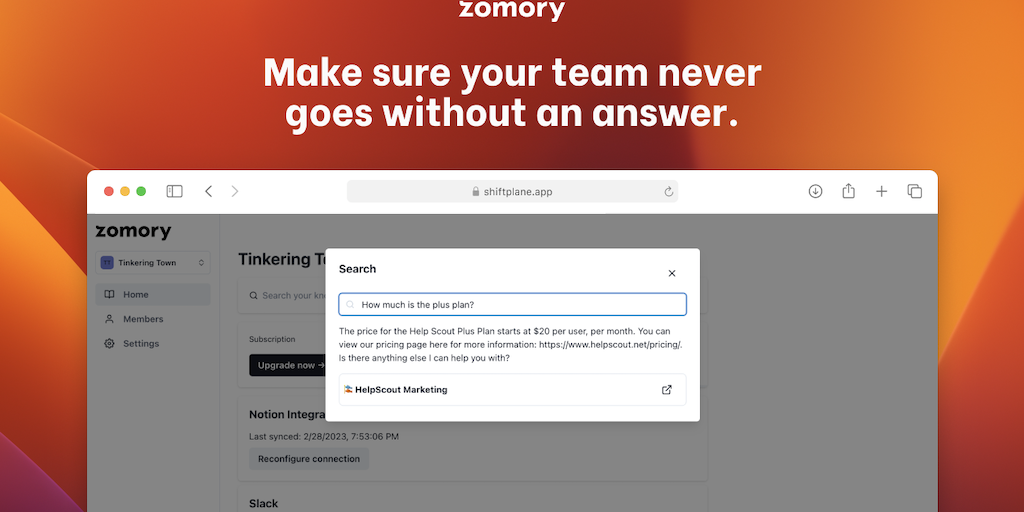 Zomory helps your team answer questions quick. Ask in natural language and Zomory will look up the answer in your Notion, personalized just for your team. Use Zomory to provide a 24/7 assistant to you