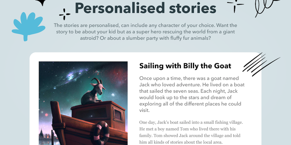 Create personalized, instant bedtime stories in seconds. Generate a story about your child, including some family members as characters, and add a genre, story style, moral, and much more – generated
