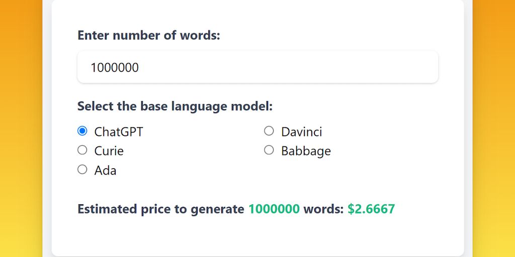 If you're using OpenAI API to generate AI content, here is a simple calculator that will estimate how much it will cost to generate a certain number of words. Just enter the number of words & it will