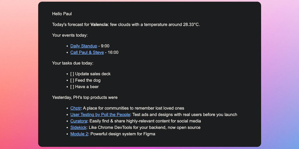 I live in my inbox and I wanted to save myself some time checking the same things over and over every morning, so I built ledigest.email a daily automated email with the info I'm interested in every m