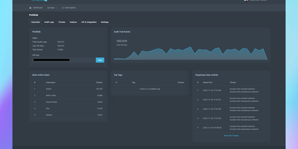 For company or developer who need audit trail for app, LogZab provide managed audit trail as a service. Enterprise grade security, automatic fraud/threat detection, AI powered auditing & analytics.