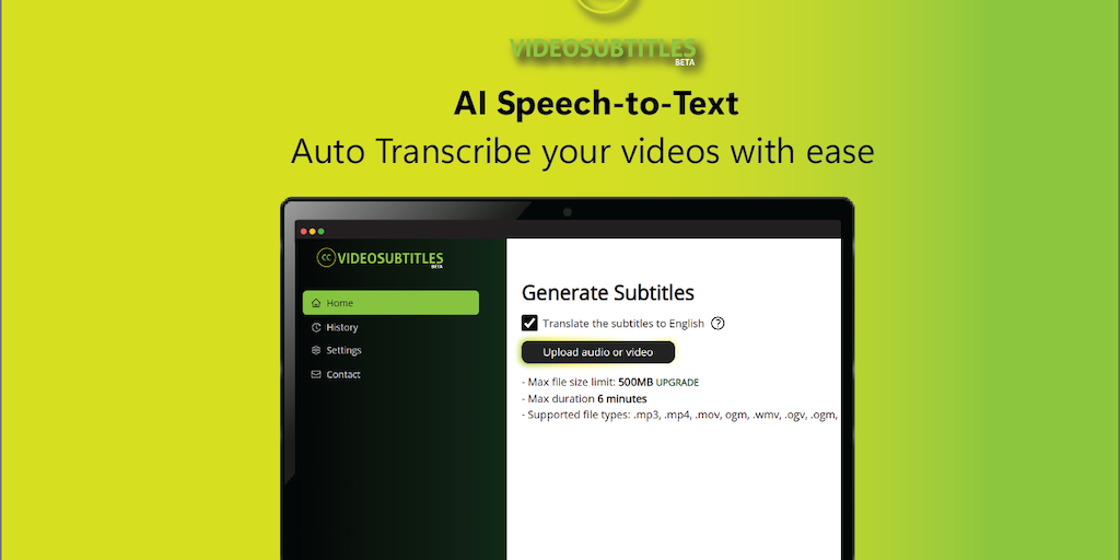 VideoSubtitles is a tool that automatically generates subtitles for videos. The app uses advanced AI algorithms to transcribe video and also can translate it into English subtitles. It generates files