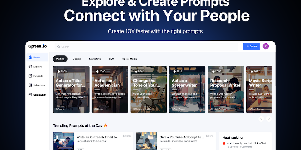 GpTea - prompt potions brewed to unleash ChatGPT's creative powers. Discover, share, and upvote the best prompts. Never struggle for words again, the library of prompts to spark ideas.