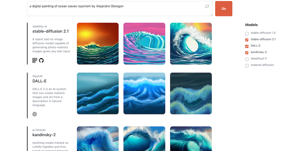 🦓Zoo is a playground for comparing AI image models. Type in your prompt and see outputs from DALL-E, Stable Diffusion, Kandinsky, and other open source models side by side. Think of it like http://nat