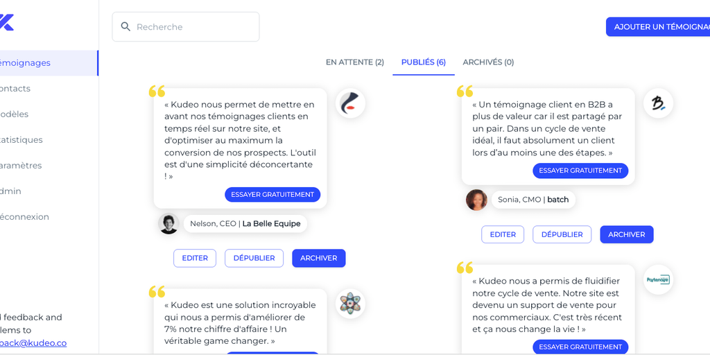 Kudeo helps our customer to collect and display their testimonials on their website. Collect is simple : emailing tool integrated Display in one click : no more integrations