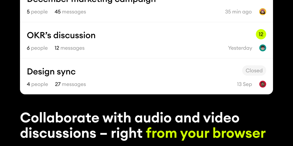 One topic, no meetings. Create a discussion right from your browser and invite anyone with a link. Collaborate with audio, video, and text and close out the discussion with a conclusion when it’s done