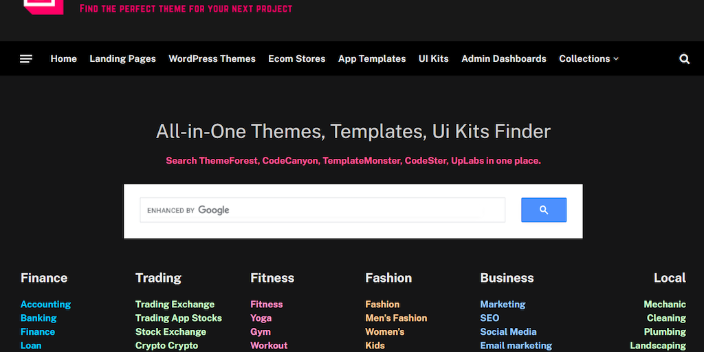ThemeFinder Pro is an all-in-one 'Template search engine' that searches Top Theme Marketplaces like ThemeForest, CodeCanyon, TemplateMonster, CreativeMarket, Template.net in one place and saves you a