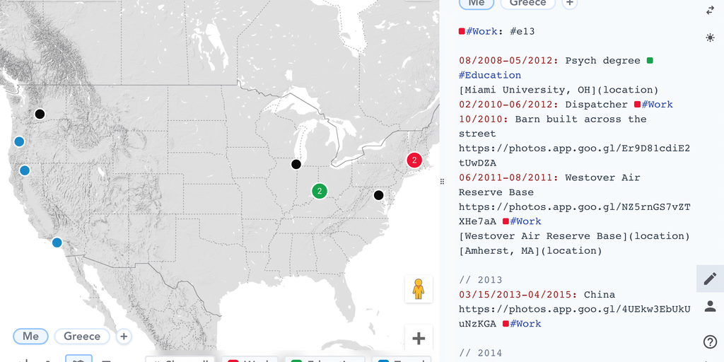 Easily visualize series of events just by typing them out. Author markdown-like documents to see a cascading timeline or map; tag and filter them to get a focused view. Supports links, images, locatio