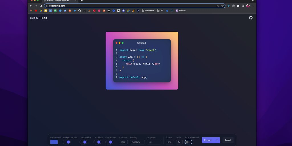 This is a simple and customizable code to image converter. You can use this tool to convert your code snippets to beautiful images. For those who share codes to social media or on blogs, this will be