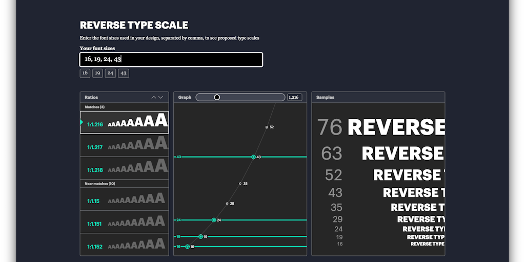 Reverse Type Scale lets you find typographic scales that match the fonts sizes used in your design. Enter the font sizes used in your design to see proposed type scales. Review proposed scales, or adj