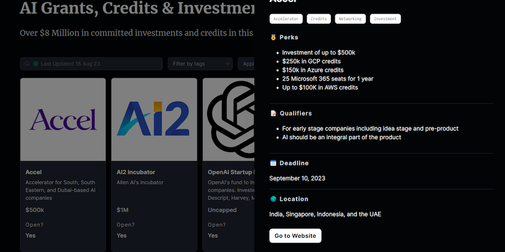 Curated list of accelerator programs, investment opportunities, and free credits available for AI builders. Browse by program perks, qualifiers, accepted countries, and deadlines - all in a single pla