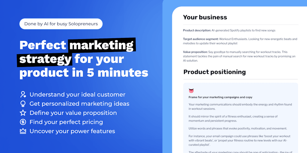Brilliant product idea is not enough. You need brilliant marketing too. Find your audience, define your value proposition, and get personalized marketing ideas in 5 minutes with AI. Made for Soloprene