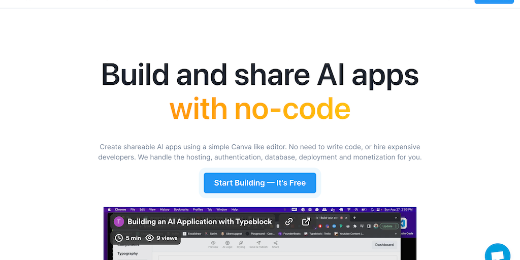 Typeblock empowers businesses to create shareable AI apps using a simple Canva like editor. No need to write code or hire expensive developers. We handle the hosting, database, user authentication, pa