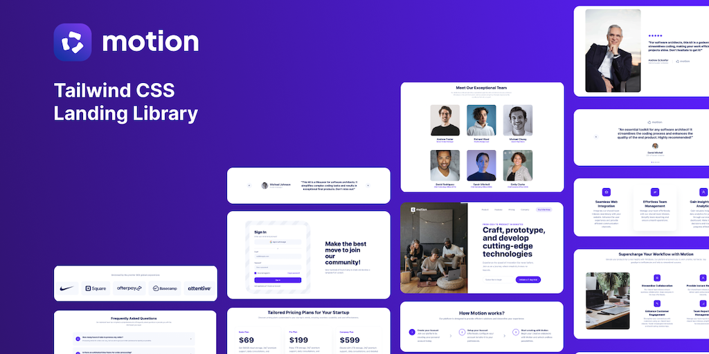 Elevate your web design game with the Motion Landing Library, a powerhouse of over 50 meticulously crafted components designed to supercharge your Tailwind CSS projects.