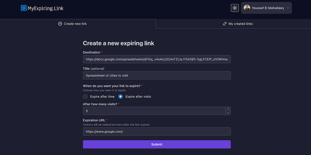 MyExpiring.Link is a URL shortener with a kick — you can choose how you want your link to expire; either after being visited, or after a certain time. Once your link expires, visitors will be redirect