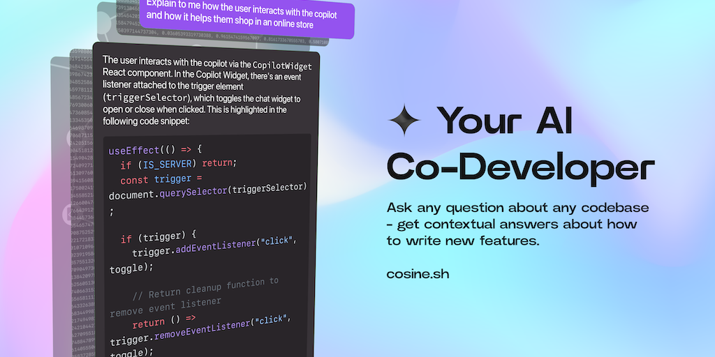 Cosine understands your codebase better than you do. It supports 50+ coding languages, allowing developers to ask any question about their codebase, get explanations about any feature and get suggesti