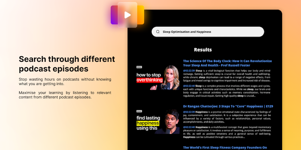 With Synthesis Youtube, you can search through your favourite podcasts or video channels, and have access to the most important points along with timestamped links to the relevant video segment in min