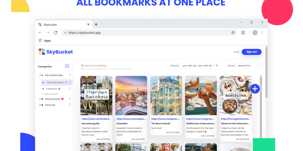 SkyBucket provides an all-in-one concept platform to combine and manage bookmarks from various social networks and sources by creating folders, adding descriptions and using filters and search bar. It