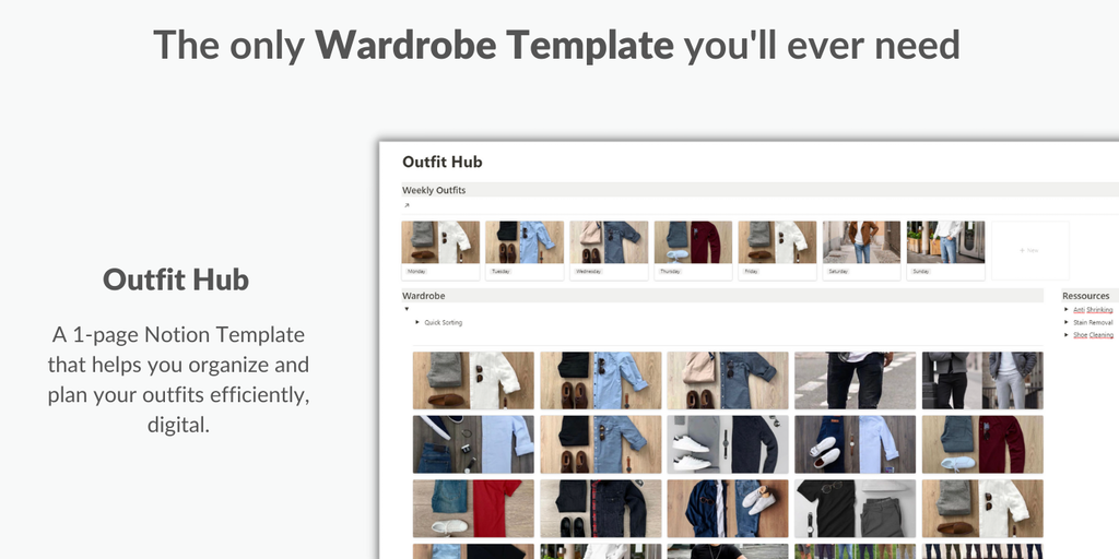 The Outfit Hub is an easy-to-use minimalistic 1-page Notion Template that helps you organize your wardrobe and plan your outfits in one place, digitally.