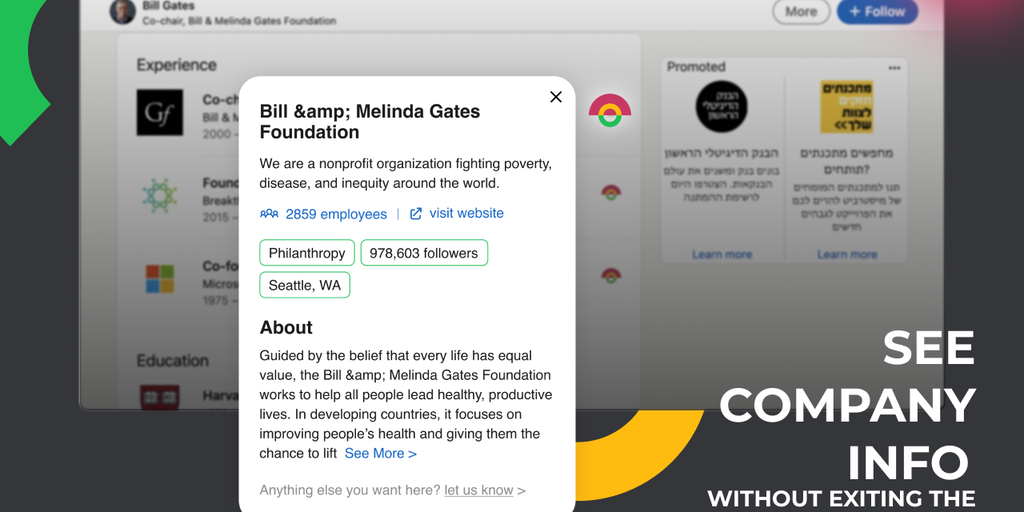 Save yourself needless clicks and your precious time & See company info without exiting the profile page Simple as that