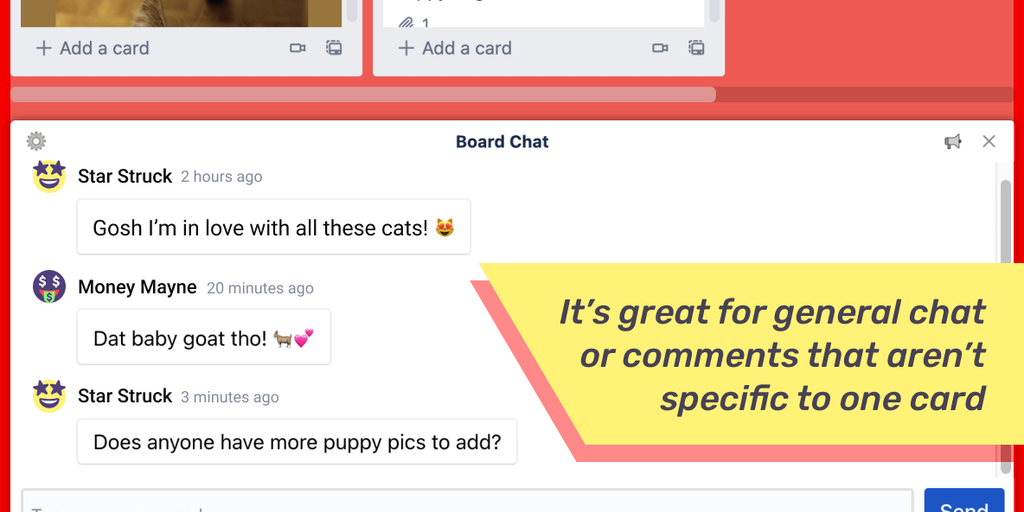 The Board Chat Power-Up allows Trello users to add a simple text-based chat room to any of their boards with just a few clicks. These chat rooms are great for contextual conversations within a Trello