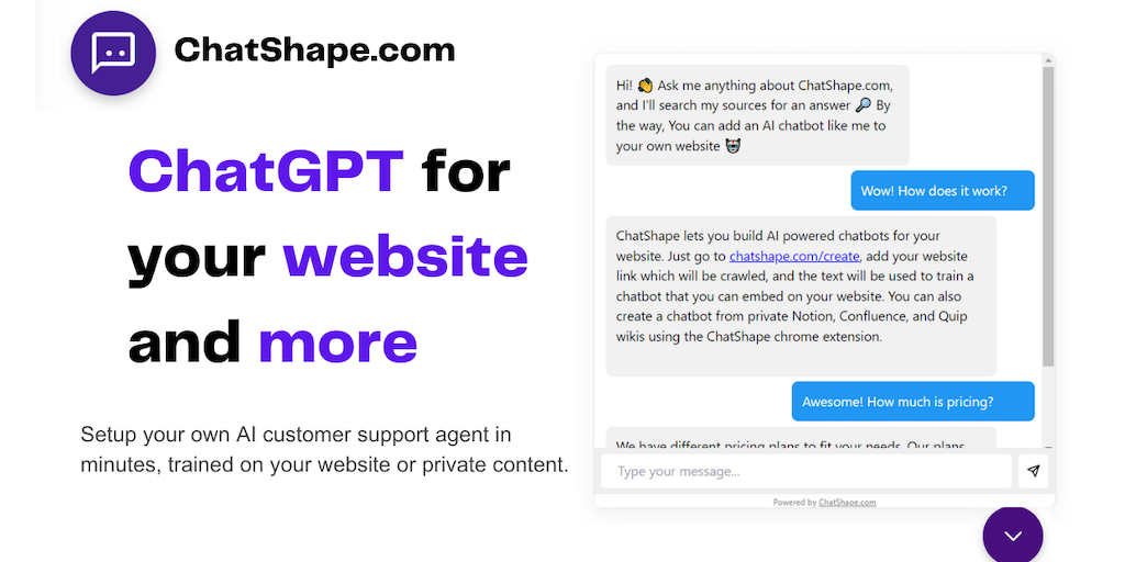ChatShape lets you train a custom AI chatbot on the content of your website (or private content) in minutes, then you can take that AI and add it to your website. Customize the AI to enhance your cust