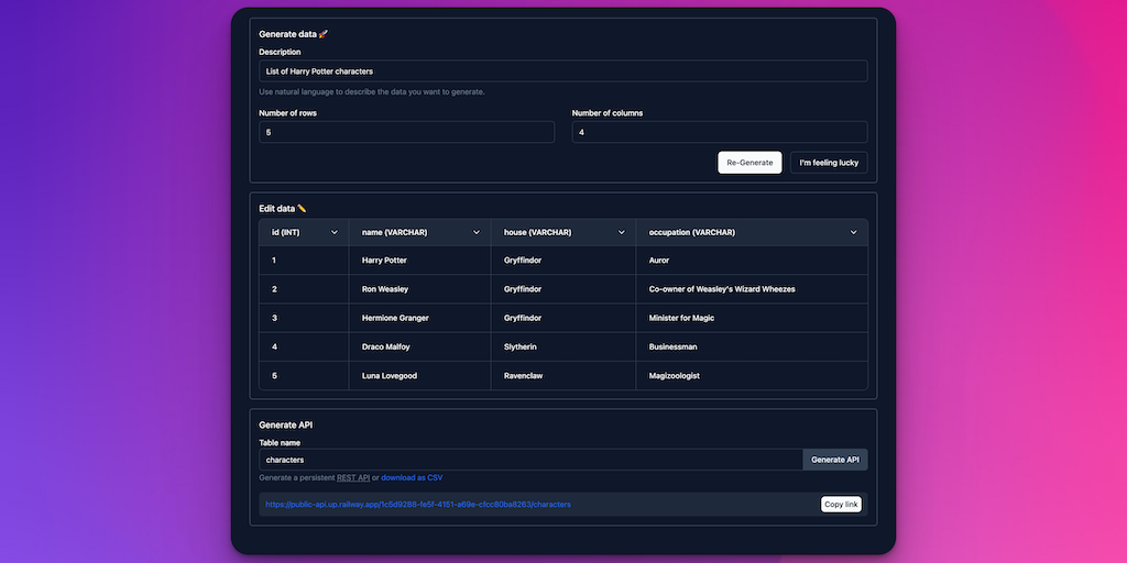 Use GPT to generate a mock REST API backed by a realistic dataset – with just one phrase. Craft the dataset to your needs, plug in the generated API into your demos and prototypes to ship better and f