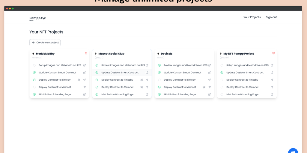 Rampp is the ultimate tool for NFT creators and community managers to launch and manage their projects & community without a single line of code. ✅ Create a contract ✅ No-code mint website ✅ Community