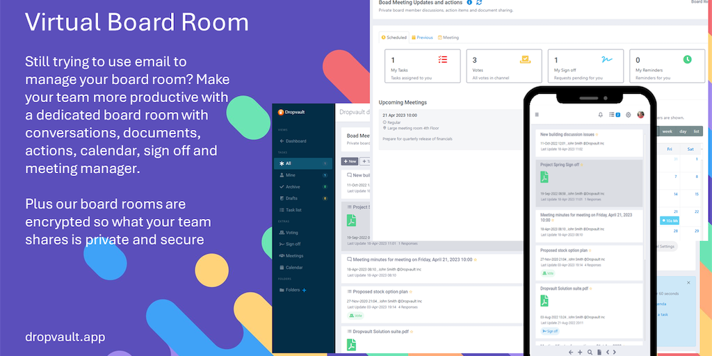 Dropvault Virtual boardroom provides a secure and private collaboration space to discuss and share sensitive data for board members - Discuss, share, meet, vote and sign off