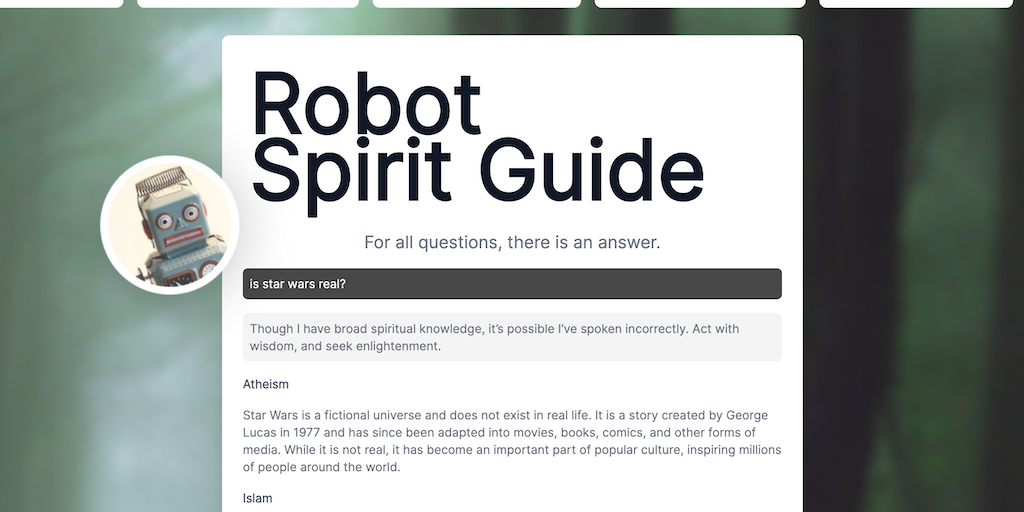 With Robot Spirit Guide you can ask questions and receive answers from a variety of religions in a single search using GPT-3 and AI.