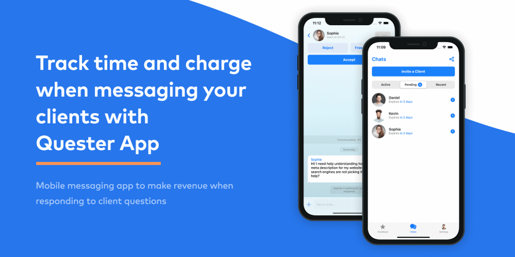 The Quester App turns communication over messaging into an additional revenue stream. With the app professionals are able to track time and automatically charge when messaging clients.