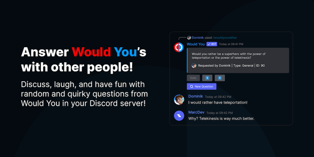Would You is a discord bot helping companies and community managers increase the engagement of their users in their discord server.
