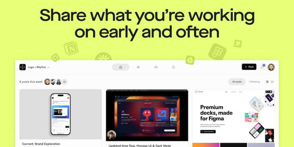 Current increases your team’s visibility on the work happening across the company. Designers, Engineers, and PMs can share work from Figma, Loom, Miro, Notion, Drive, Github, and more. Weekly AI-power