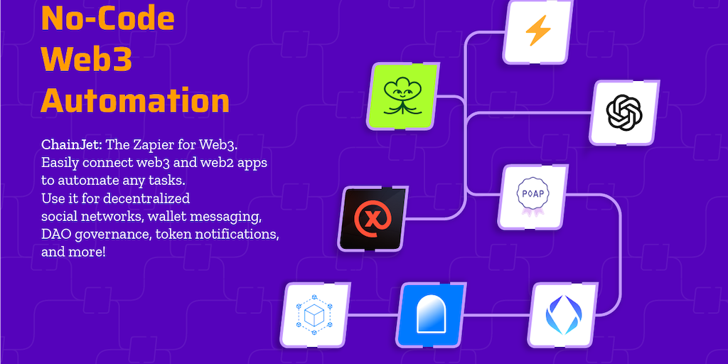 ChainJet is the Zapier for Web3: A no-code platform empowering you to build Web3 automation. Connect with dozens of Web3 protocols, streamline your tasks, and create custom Web3 automations with ease.