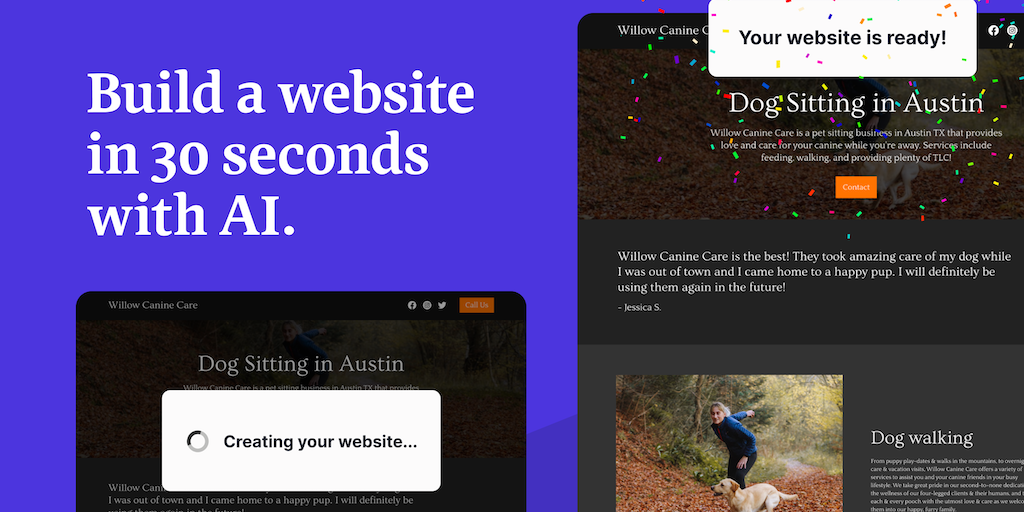 Based on your location and business type, Durable AI builds you a mobile-friendly website in less than a minute. Images, copy, fonts, colours, and a lead generation form included. It's the fastest way