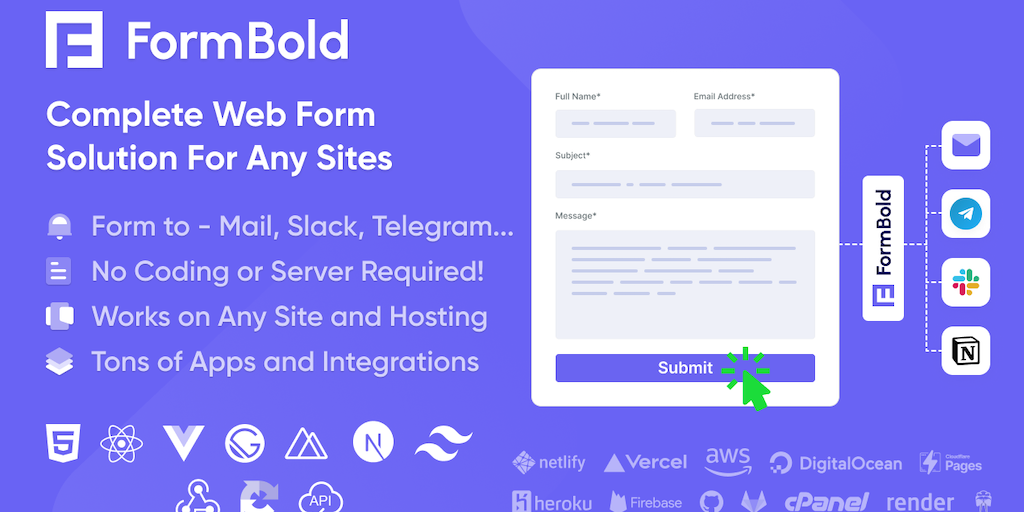 Powerful Web Form Solution - works with all Hosting Platforms and Frameworks to make Static Forms fully working in seconds, without Coding or Server-side Dependencies. Receive Site Form submissions di