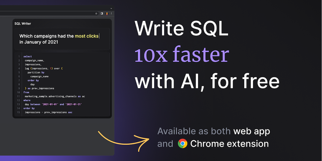 Every data superhero needs a Sidekick. Whether you’re a data pro or SQL newbie, use our FREE AI recipes to instantly perform time consuming data tasks. Draft + fix + optimize SQL. Write docs. Script p
