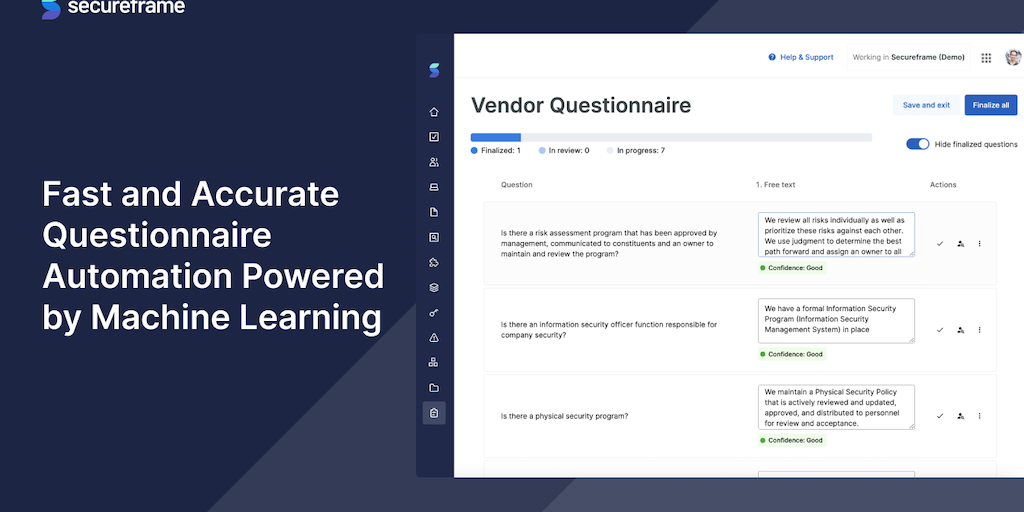 Secureframe Questionnaires makes it fast and easy to respond to RFPs and security questionnaires using AI.