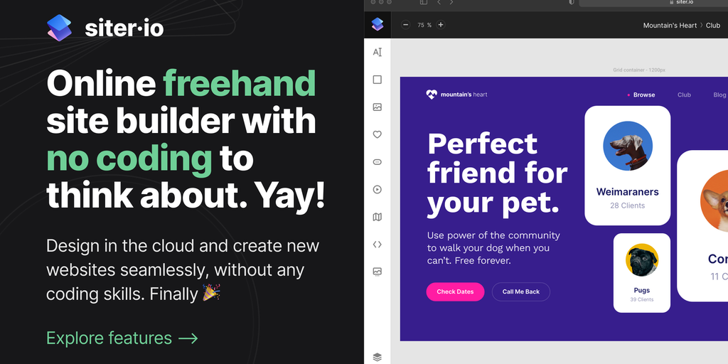 Siter.io is a no-code website builder that allows you to design and publish websites without any code. It works by designing directly in the browser, freehand, using tools you already know.