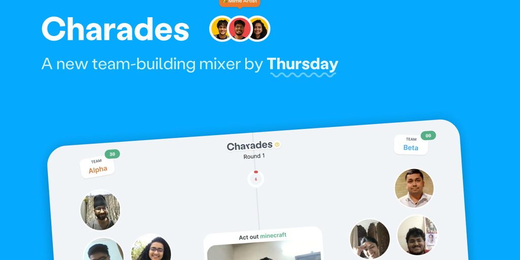 A classic activity reimagined for remote teams. A brand new mixer by Thursday. Act out a word given by the opposing team and make your own team guess it in 60s. Don’t just break the ice, shatter it wi
