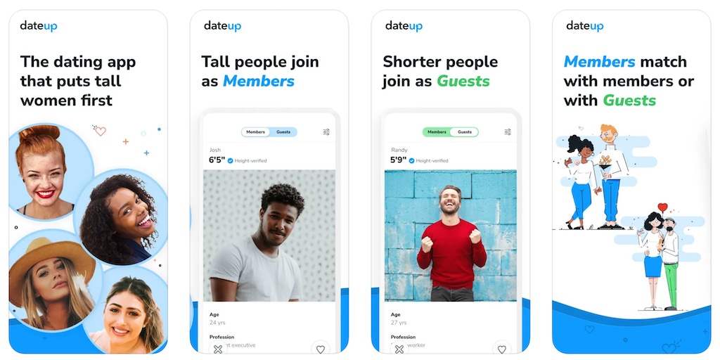 DateUp is a dating platform connecting tall people with other tall people nearby or shorter people interested in tall matches. Members can quickly verify their height through DateUp's unique process.