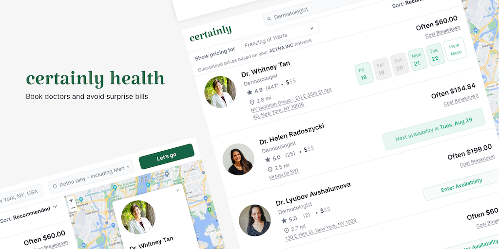 Certainly Health is a marketplace to book doctors (launched in NYC) with upfront costs. Enter your insurance and visit reason, and we'll predict and guarantee your out-of-pocket costs for every health