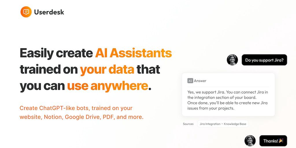 Userdesk - AI Assistants trained on your data that you can use anywhere | Product Hunt