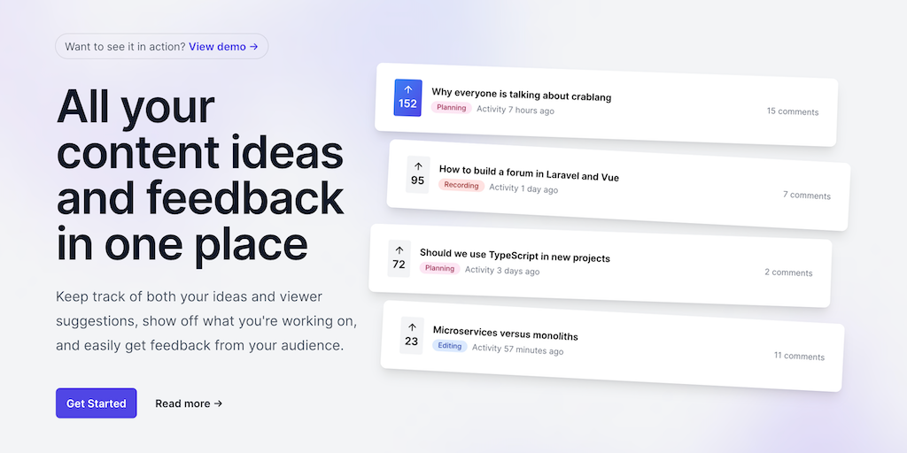Suggest.gg is a platform that lets you organize and collect ideas and feedback aimed at content creators. Your audience can view what you're working on, leave comments, and vote for the ideas they're