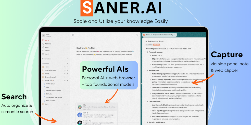 Tired of messy notes and forgotten ideas? Too busy to organize every note? Meet Saner.ai - Your simple yet powerful AI second brain. It saves time and boosts your productivity.