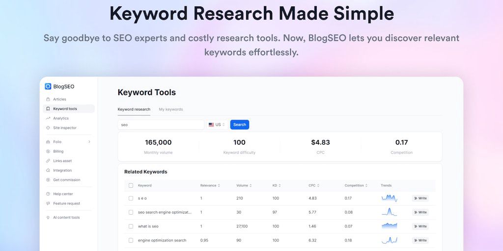 BlogSEO AI's latest upgrade brings detailed keyword research, competitor research, an improved content creation pipeline, and website performance tracking to the app.